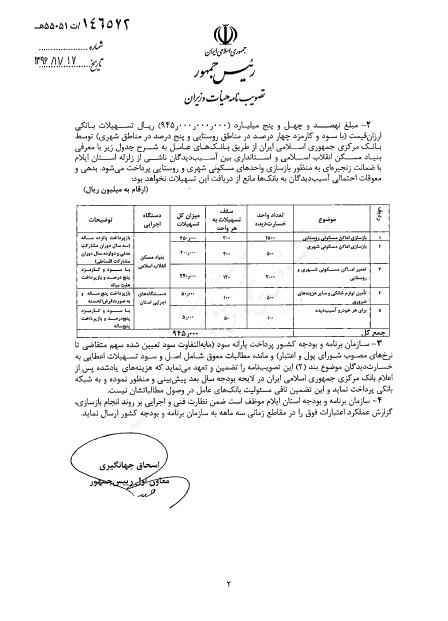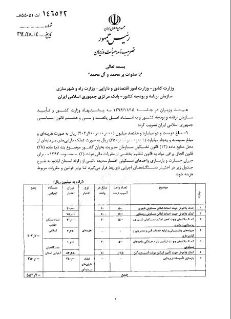به گزارش پایگاه خبری بانک مسکن- هیبنا به نقل از ایبنا، در بخشی از مصوبه هیات وزیران که توسط اسحاق جهانگیری ابلاغ شد آمده است: مبلغ دویست و دو میلیارد و هفتصد میلیون ریال به صورت هزینه ای و مبلغ سیصد و پنجاه میلیارد ریال به صورت تملک دارایی های سرمایه ای از محل منابع ماده ۲ قانون تشکیل سازمان مدیریت بحران کشور موضوع بند م ماده ۳۸ قانون الحاق برخی مواد به قانون تنظیم بخشی از مقررات مالی دولت برای جبران خسارت و بازسازی واحدهای مسکونی خسارت دیده ناشی از زلزله از زلزله استان ایلام به شرح جدول در اختیار دستگاه های اجرایی ذی ربط قرار می گیرد تا برابر مقررات هزینه شود.