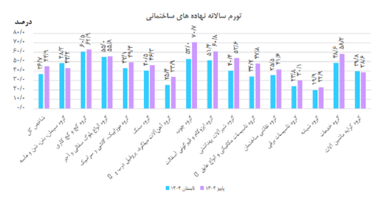 بر اساس این گزارش، تورم سالانه نهادههای ساختمانی در چهار فصل منتهی به پاییز ۱۴۰۴ به ۴۴.۹ درصد رسیده که در مقایسه با تورم سالانه فصل قبل (۳۶.۷ درصد) نشاندهنده افزایش ۸.۲ واحد درصدی است.