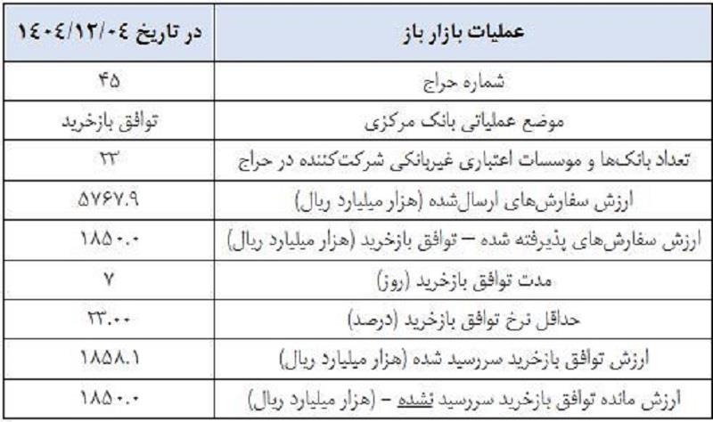 عملیات بازار باز بانک مرکزی با ۱۸۵ همت توافق بازخرید اجرا شد